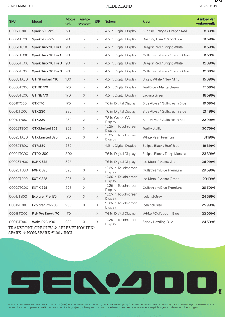 Pre-order nu de gloednieuwe Sea-Doo Spark 2026 en wees als eerste klaar voor het nieuwe vaarseizoen!   Aangeboden prijs exclusief kosten