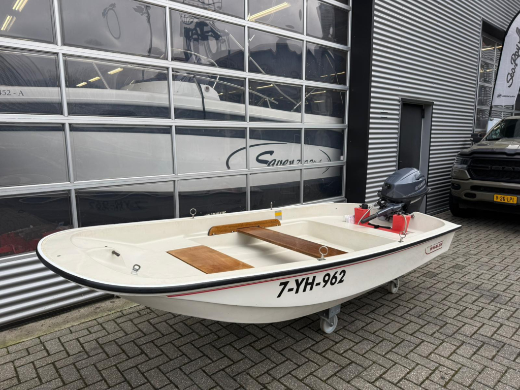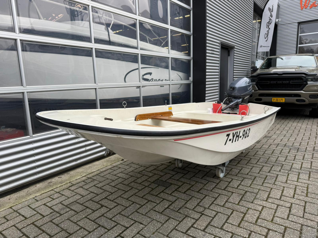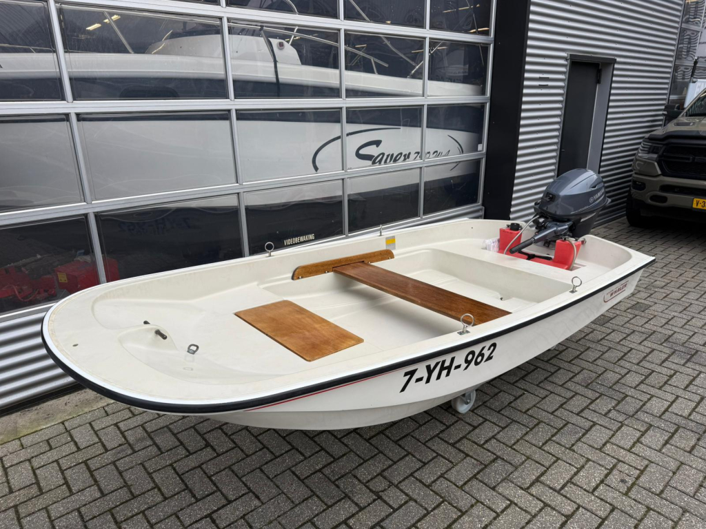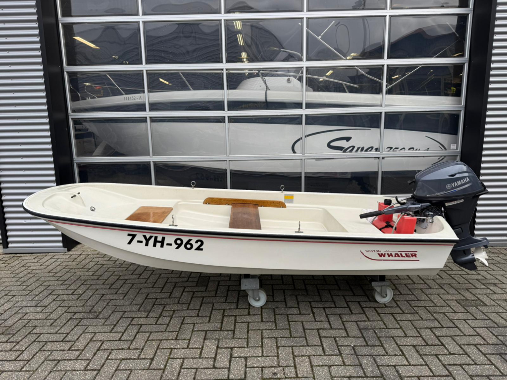 Een Boston Whaler open motorboot van circa 3,35 meter lang en 1,51 meter breed. De boot is uitgevoerd met een nieuwe 15 p