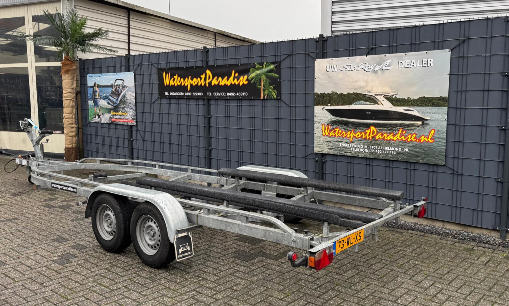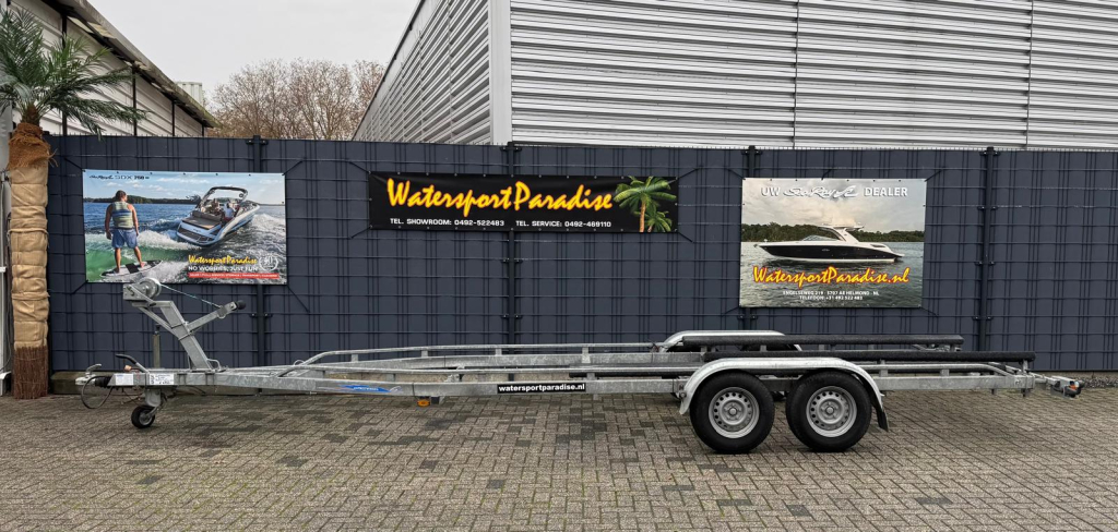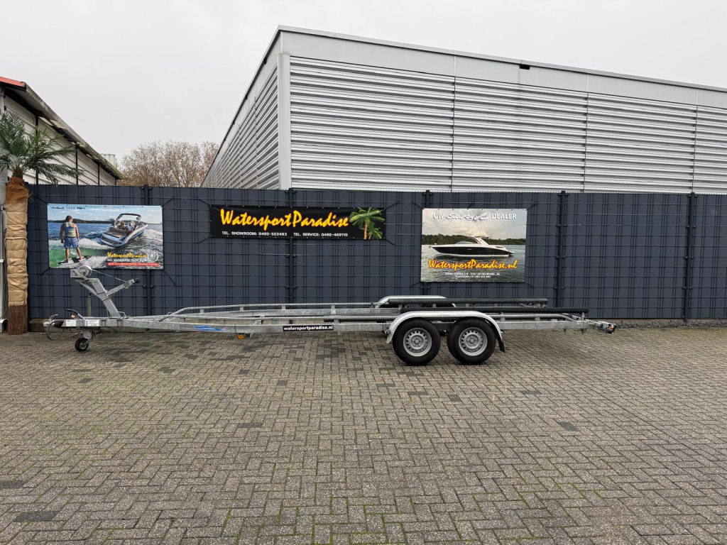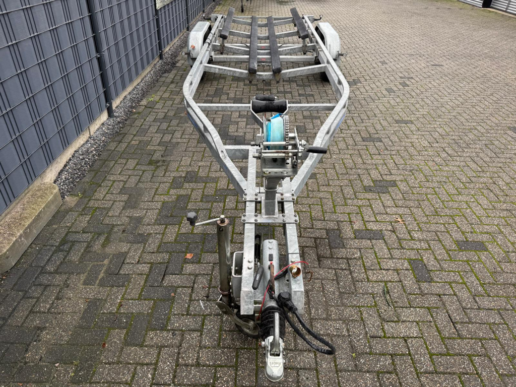 Te koop: een nette en zeer complete Freewheel boottrailer uit 2015, ideaal voor het vervoeren van grotere boten dankzij de royale lengte van 8 meter en een breedte