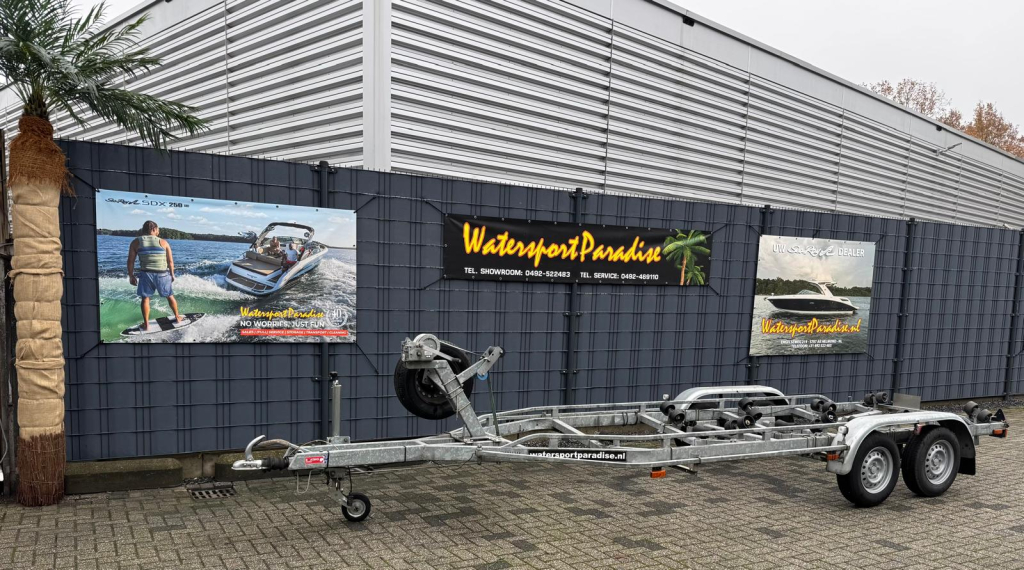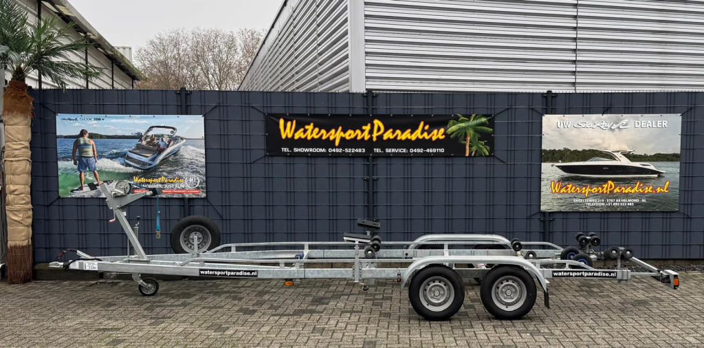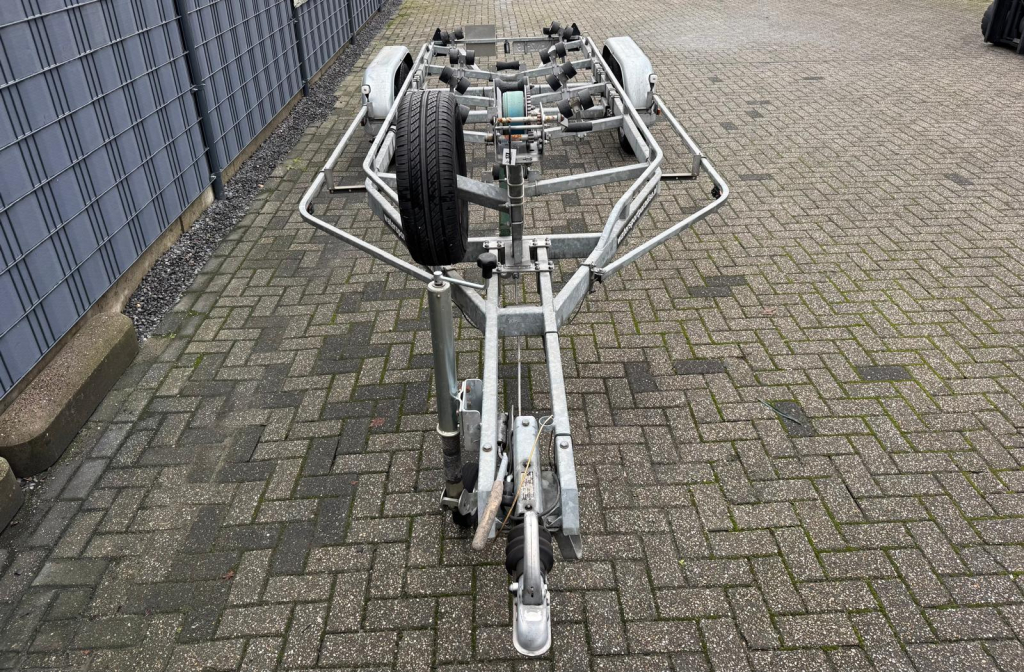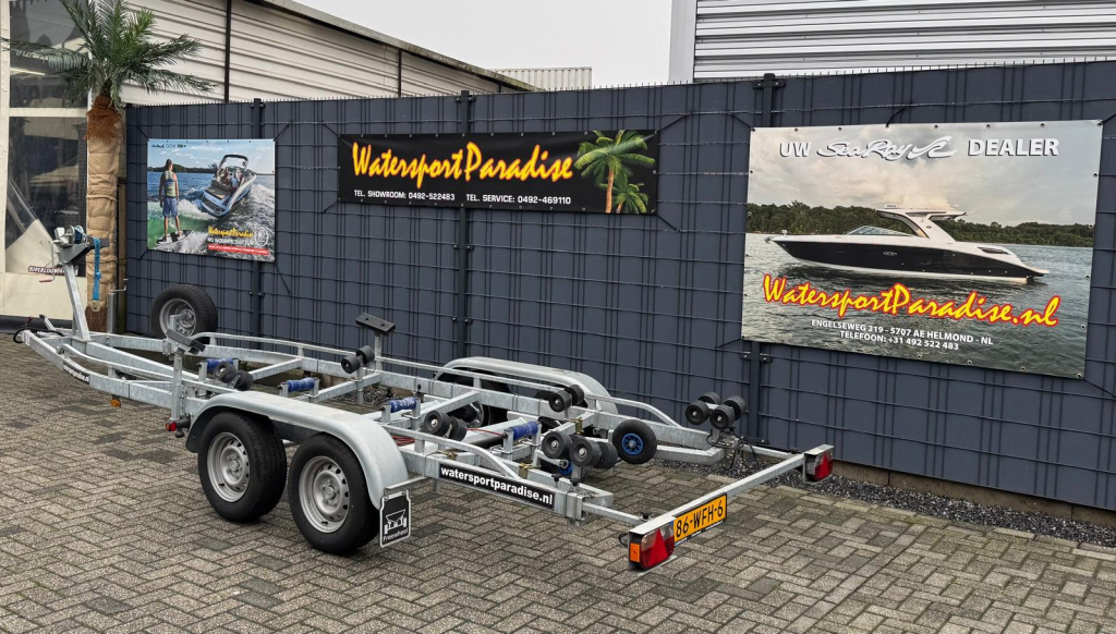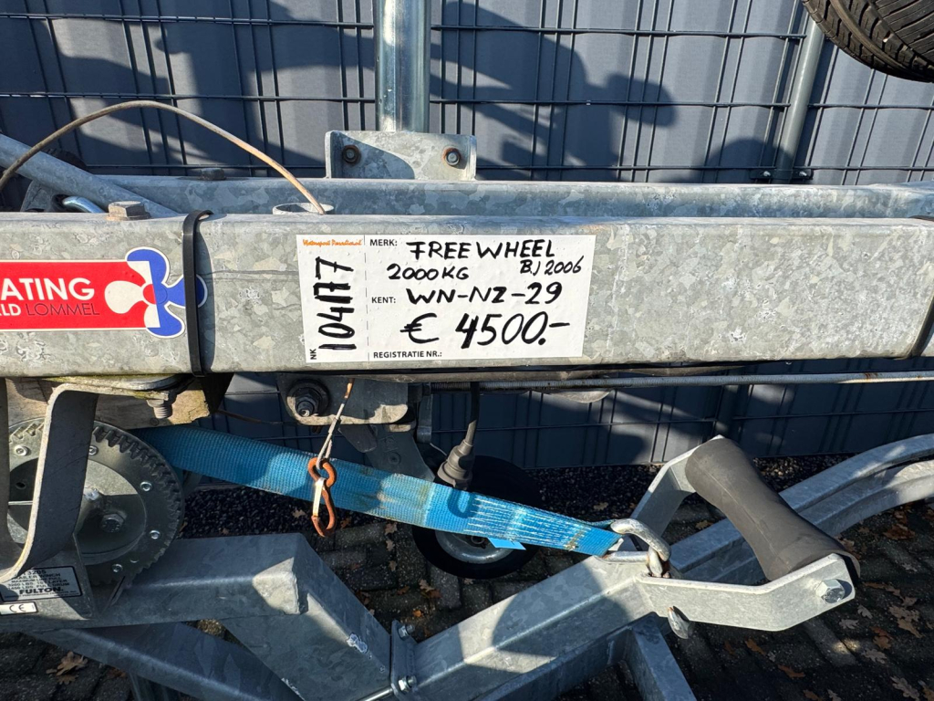 Te koop: een nette en goed onderhouden FreeWheel boottrailer (2004), voorzien van dubbelas en geremd systeem. De trailer is 6,70 meter lang en 2,15 meter breed en uitgerust met rol