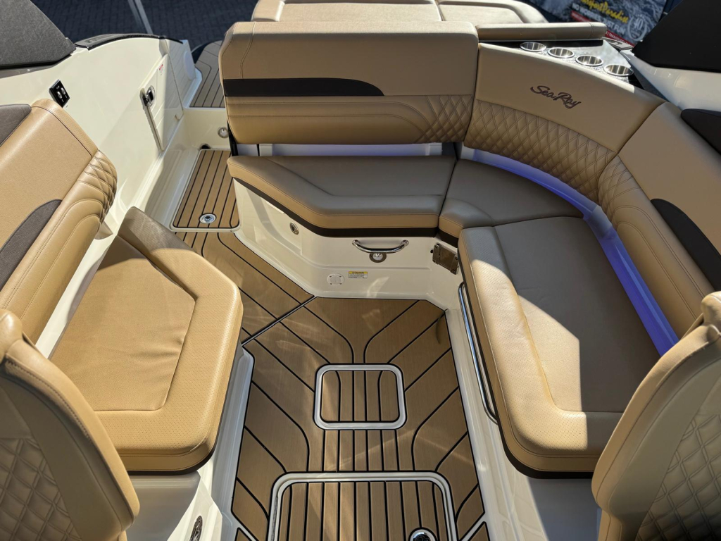 MEER RUIMTE AAN DE WATERRAND De Sea Ray SLX 260 heeft een verlengde spiegel met een breed zwemplatform en een uitgebreid zonnedek. Het zwemplatform is uitgerust met een zwemtrap en een verborgen ladder voor gemakkelijke toegang tot water. Het zonnedek is een uitstekende plek om de bezienswaardigheden langs de waterkant te bewonderen en comfortabel te ontspannen. Een geïntegreerde spiegelkoeler kan worden gevuld met ijs en drankjes of leeg worden gehouden als droge opslag om spullen veilig op te bergen.