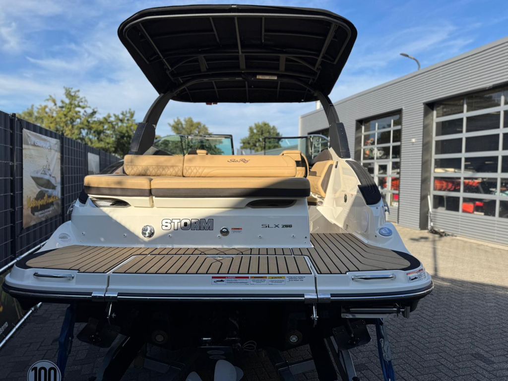 MORE SPACE ON THE WATER Edge The Sea Ray SLX 260 features an extended transom with a wide swim platform and expansive sundeck. The swim platform is equipped with a swim ladder and hidden ladder for easy access to water. The sun deck is an excellent place to take in the sights along the waterfront and relax in comfort. An integrated transom cooler can be filled with ice and drinks or kept empty as dry storage to safely store items.