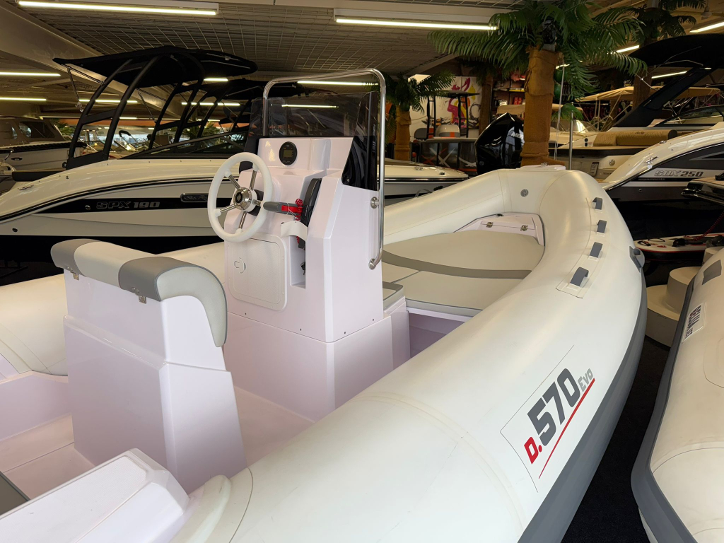 De nieuwe versie van de D.570 is volledig herzien in zijn deklay-out en heeft het mogelijk gemaakt om de wendbaarheid en beheersbaarheid die typisch zijn voor zijn afmetingen van minder dan 6 meter op briljante wijze te combineren met de vrijgevigheid en zorg van zijn binnenruimtes en van zijn uitrusting, kenmerken zoals boten met veel grotere afmetingen. De volledig opnieuw ontworpen middenconsole bevat nu ook een stoel in de boeg, met behoud van de praktische centrale multifunctionele bestuurdersstoel. De comfortabele achterbank, het grote zonnedek op de boeg, de verschillende en ruime kluisjes in combinatie met de royale glasvezelstructuur zorgen voor een navigatie rijk aan comfort en totale veiligheid.